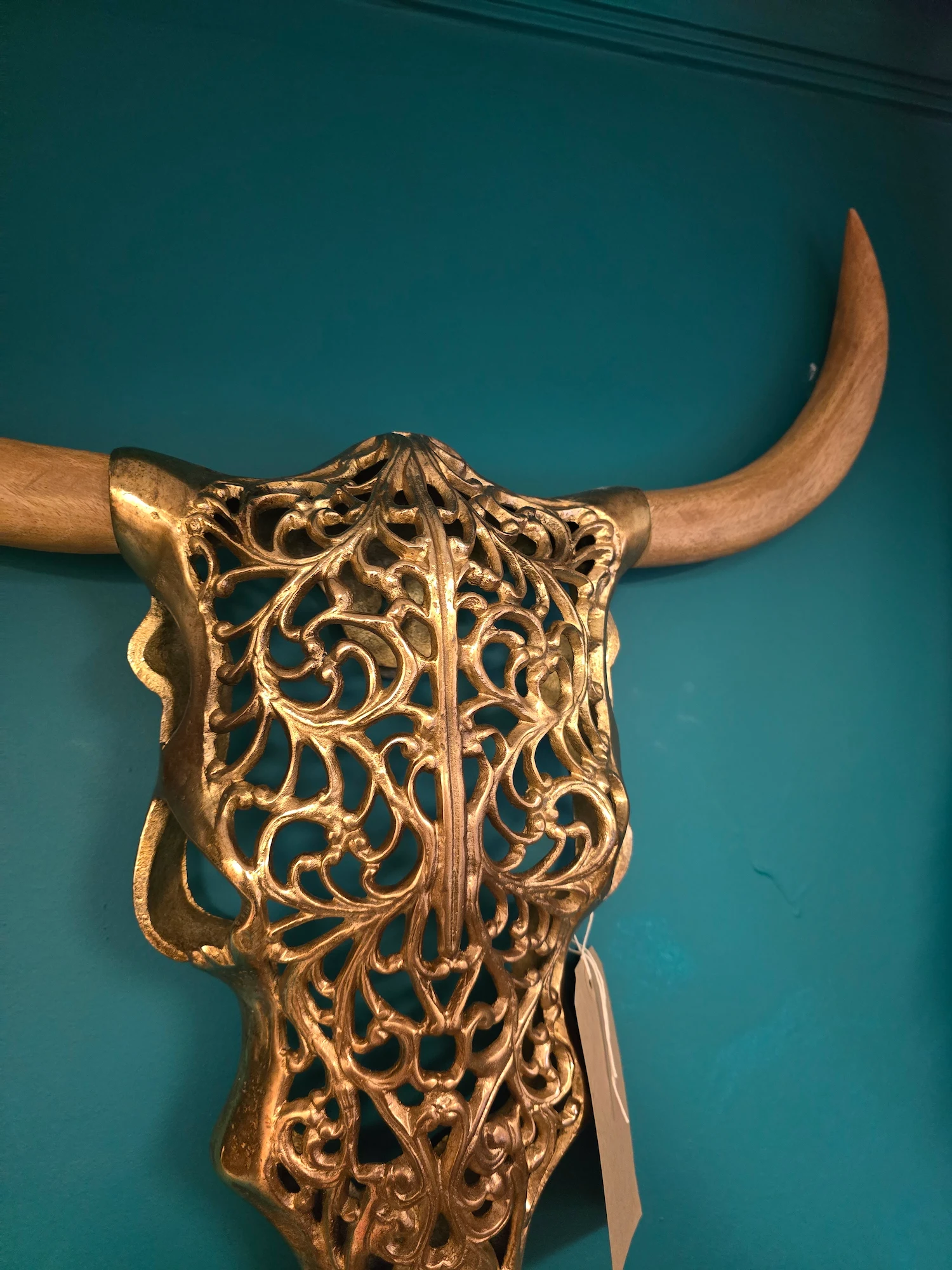 A Powerful Tribal Influenced Bison, The Design & Craftsmanship Showcased In This Piece Is Quite Astonishing – Intricate Metal-Work Creating The Mask Like Structure With a Luxe Gold Finish Over The Aluminium, Whilst The Horns Of This Bison Depiction Are Carved From Wood.